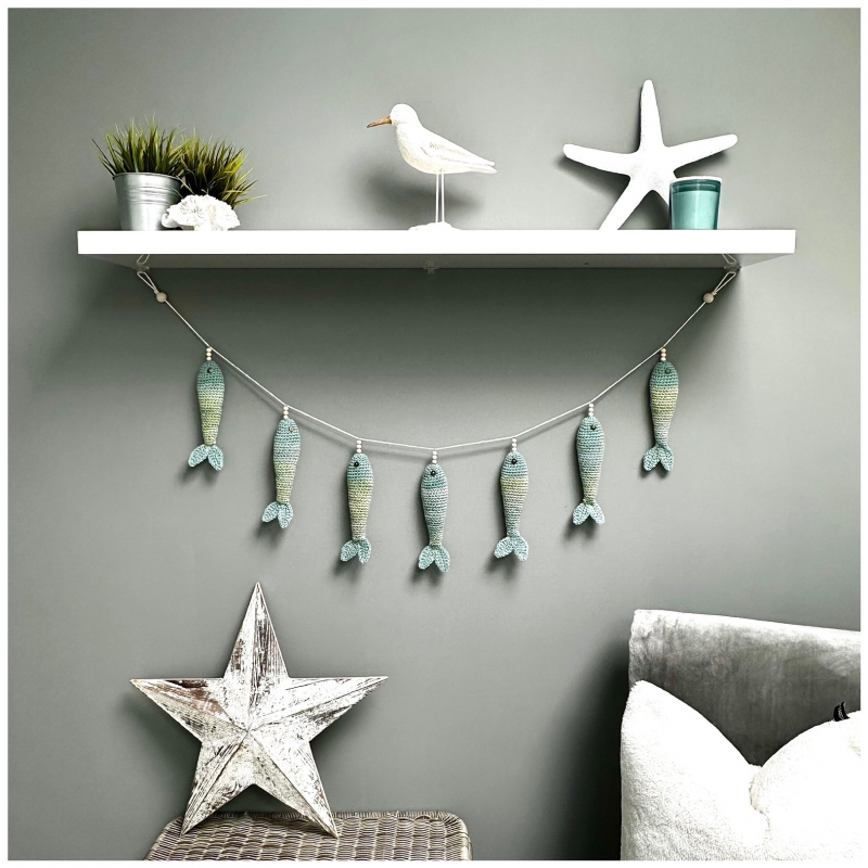 Each fish is hand crocheted in Aran yarn in variegated tones of soft teal, duck egg and aqua.