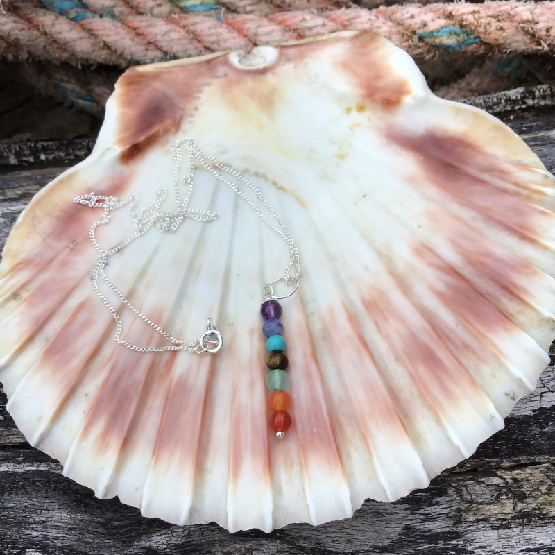 A beautiful Gemstone beads Chakra pendant. A chakra bead drop style pendant. sterling silver drop chakra pendant.The 18" chain is ,genuine sterling silver.The pendant are made with genuine 4.m.m.gemstone beads.The 7 beads that are included are:
