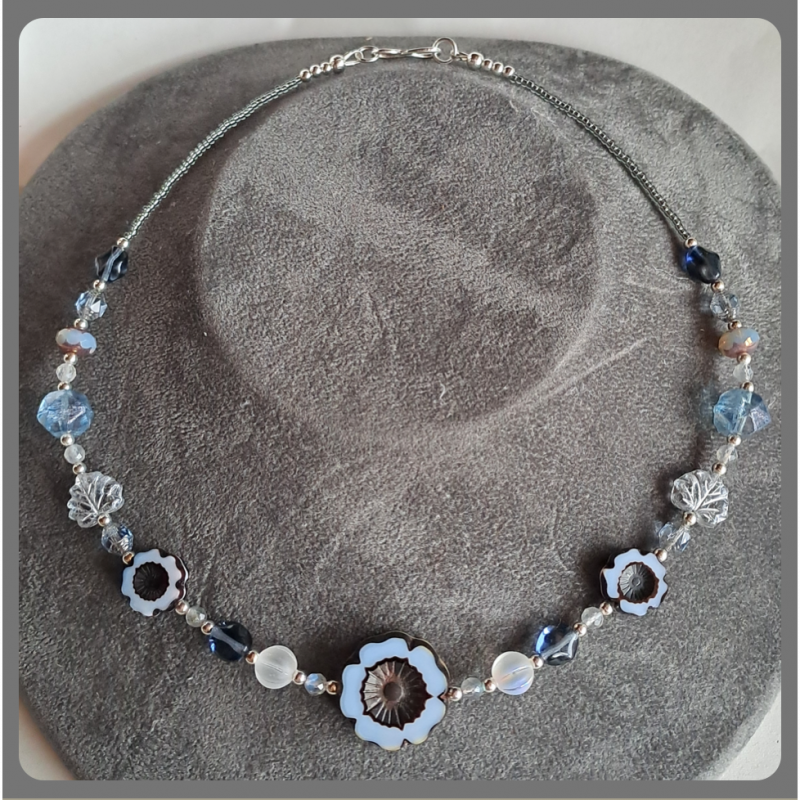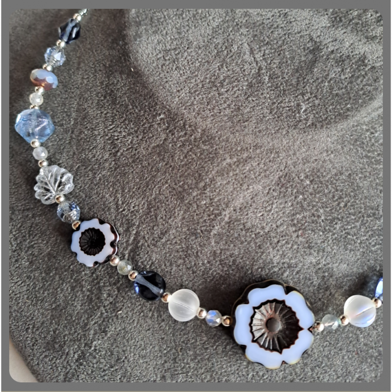 Blue, Grey and Silver Czech Glass Floral Necklace with Labradorite and sterling silver.