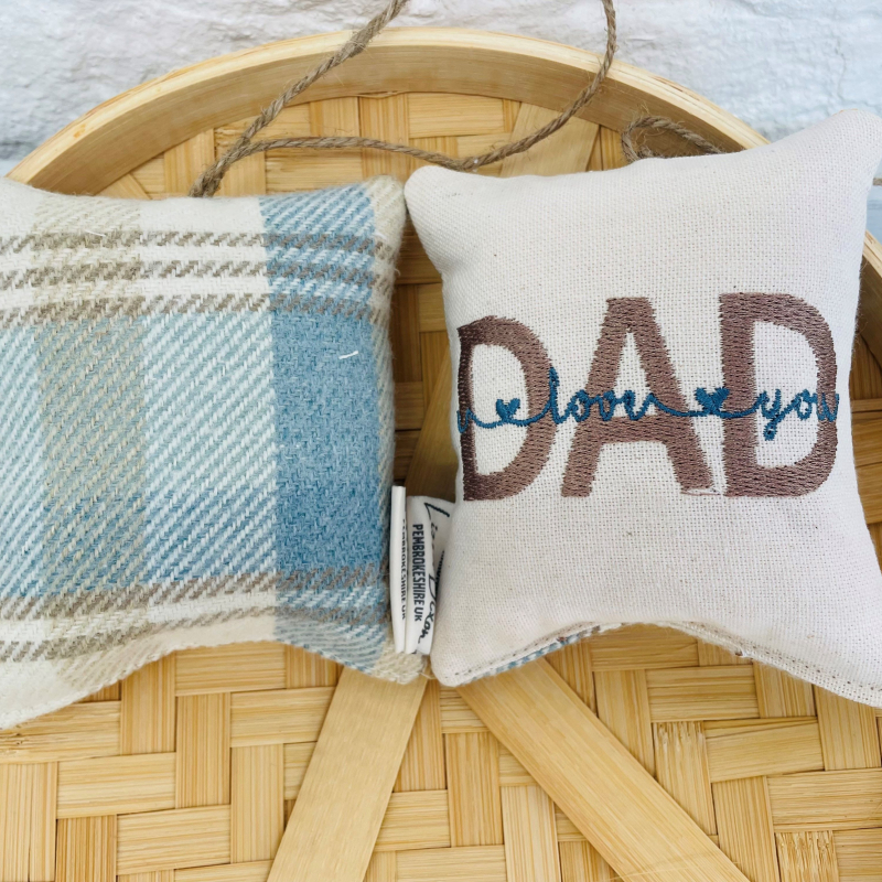 This cute Father's Day hanging decoration is super cute, with DAD I love you in welsh or English on a cream front with the wool fabric on the back.