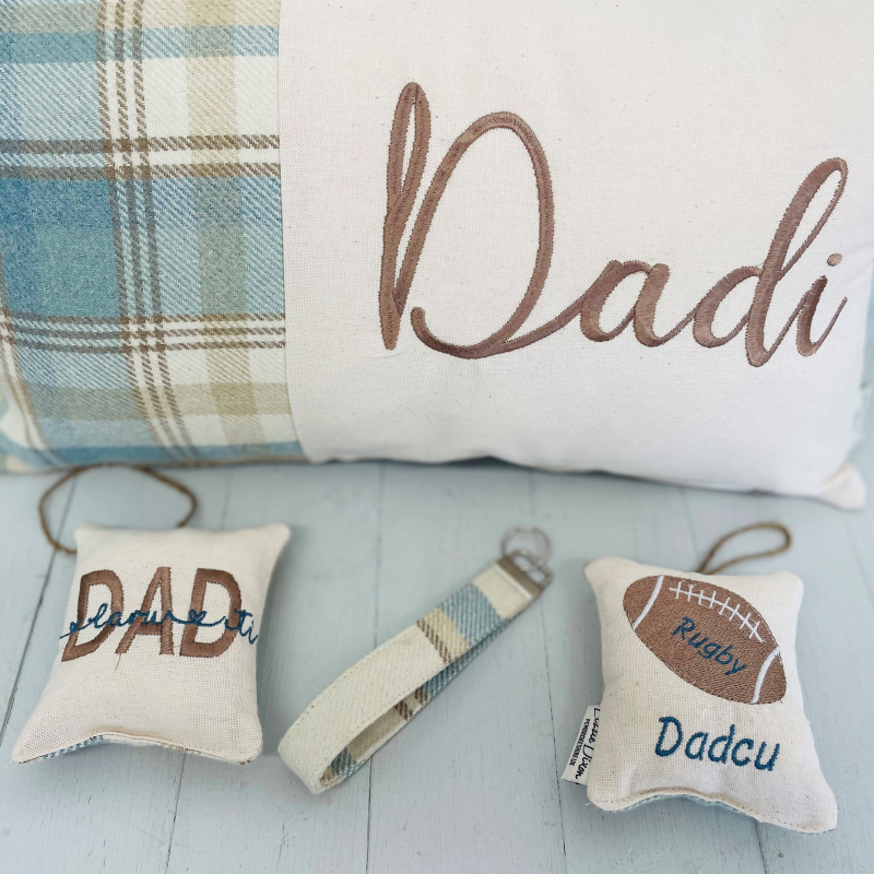 Can be personalised with any name , embroidered on a panel with the blue wool touch fabric on the side and in the back .