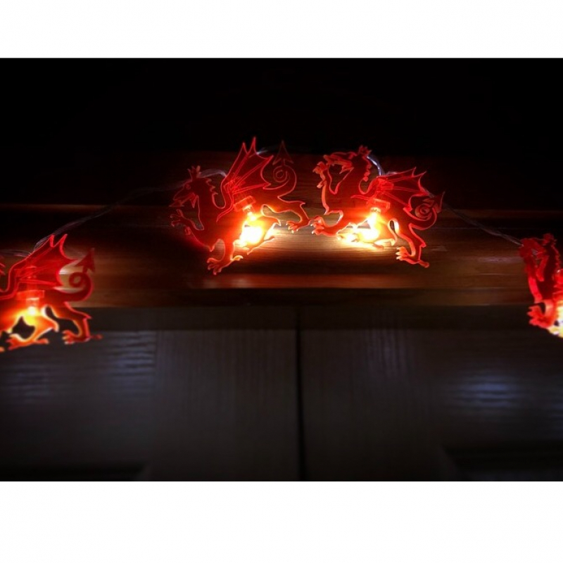 A string of 20 battery operated LED lights with acrylic Welsh dragons.