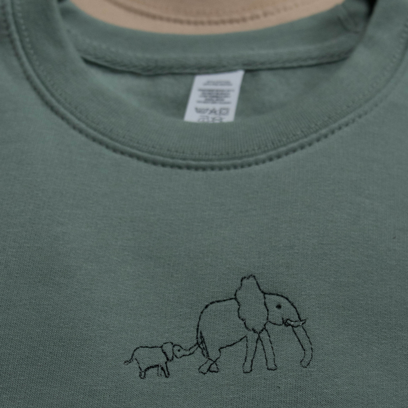 Machine embroidered elephants on dusty green sweater