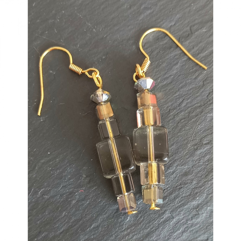 Unusual and beautiful smoke coloured earrings made with glass cube beads. Tiny matching crystals complete the look.