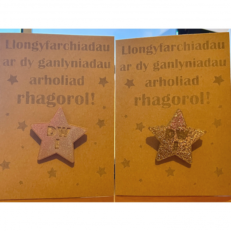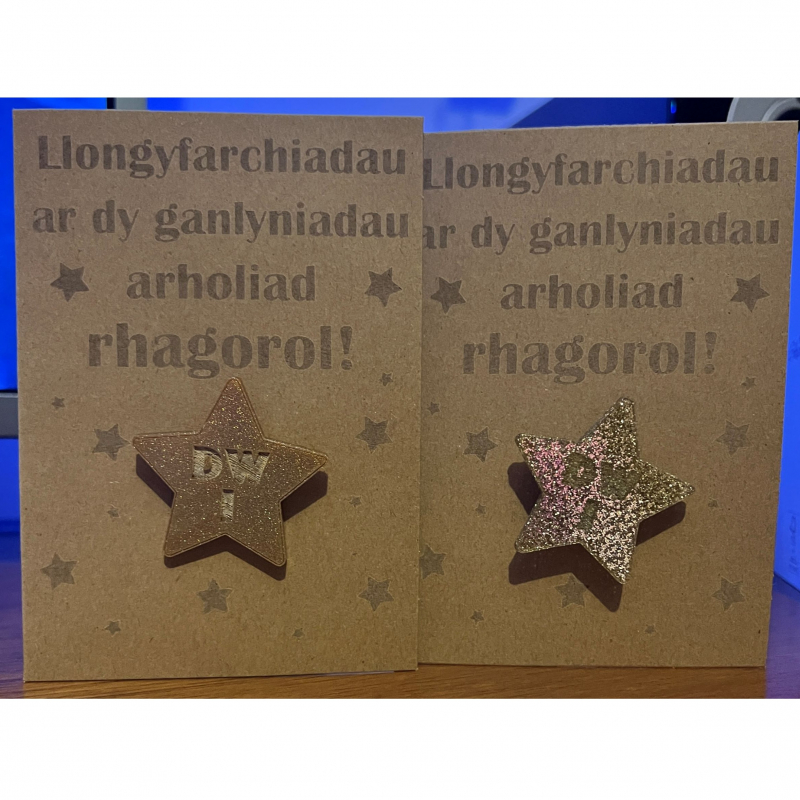 This card comes with a gold badge in the shape of a star, with ‘Dw i’ | ‘I am’ engraved on it because they are stars!