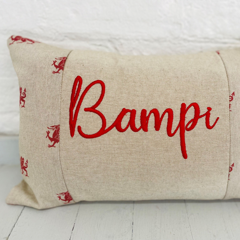Can be personalised with any name , embroidered on a panel with the welsh dragon fabric on both sides and in the back .