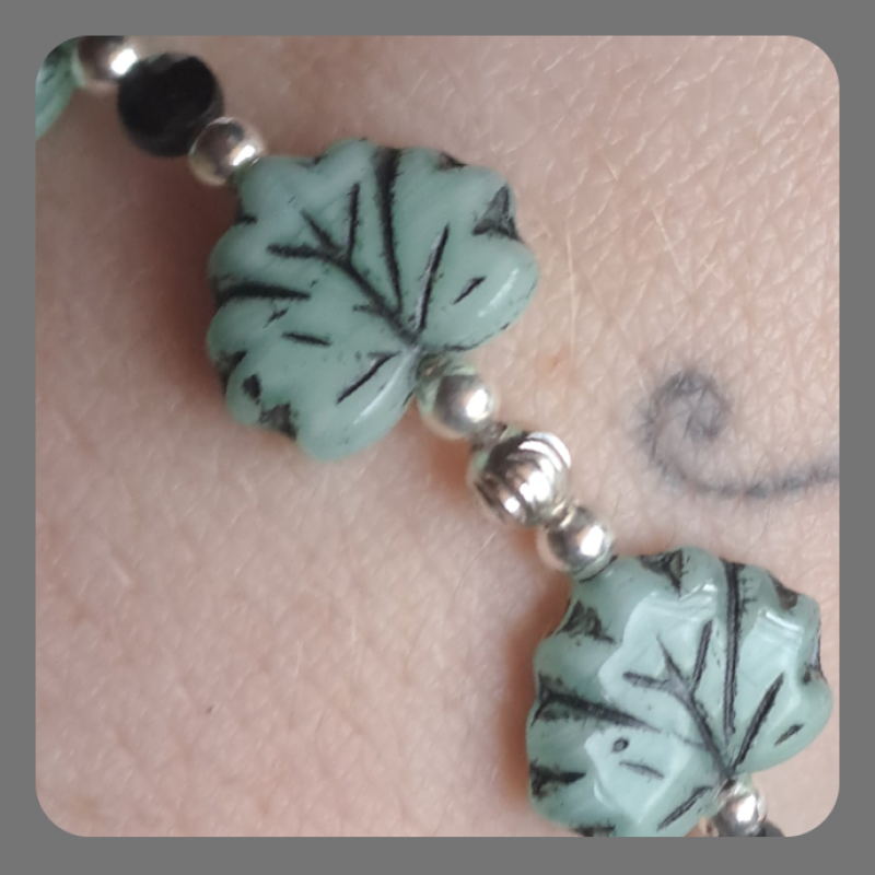 Pretty bracelet made with pastel coloured Czech glass leaves, Black Spinel and sterling silver.