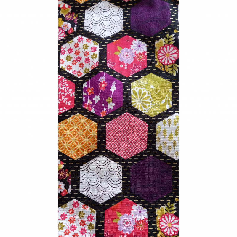 One side features a stunning hexagon pattern in black with purples, greens and pinks to name just a few. The other side has a lovely contrasting fabric with a white background and colourful Asian writing.