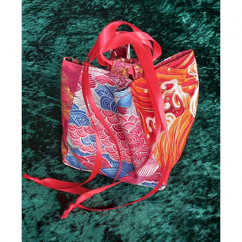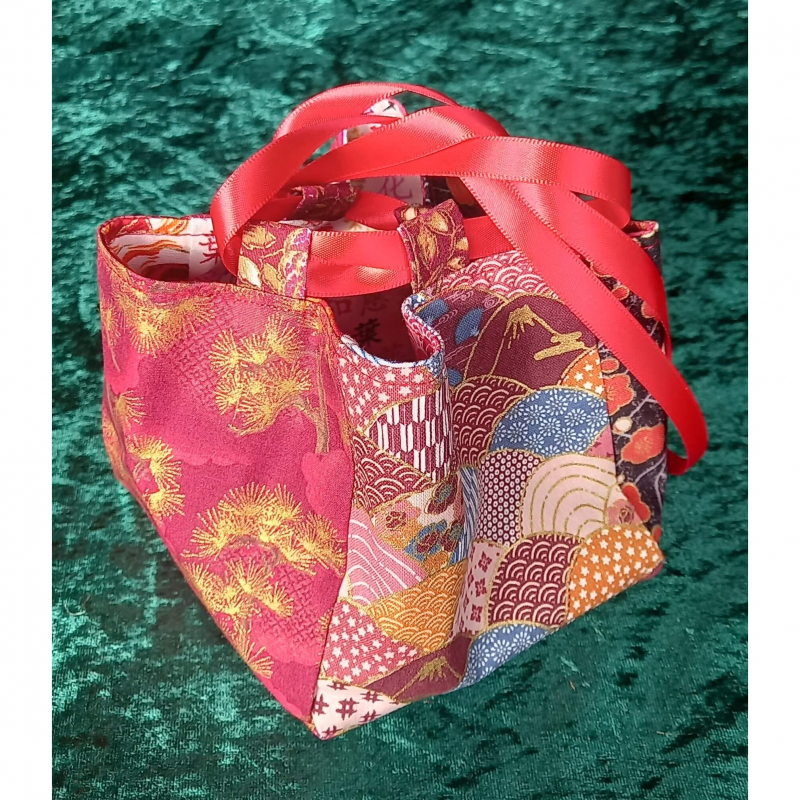 Stunning Japanese Rice Bag (Komebukuro) in beautiful Japanese fabrics with multi coloured panels and gold detailing. Finished with a beautiful red satin ribbon tie.
