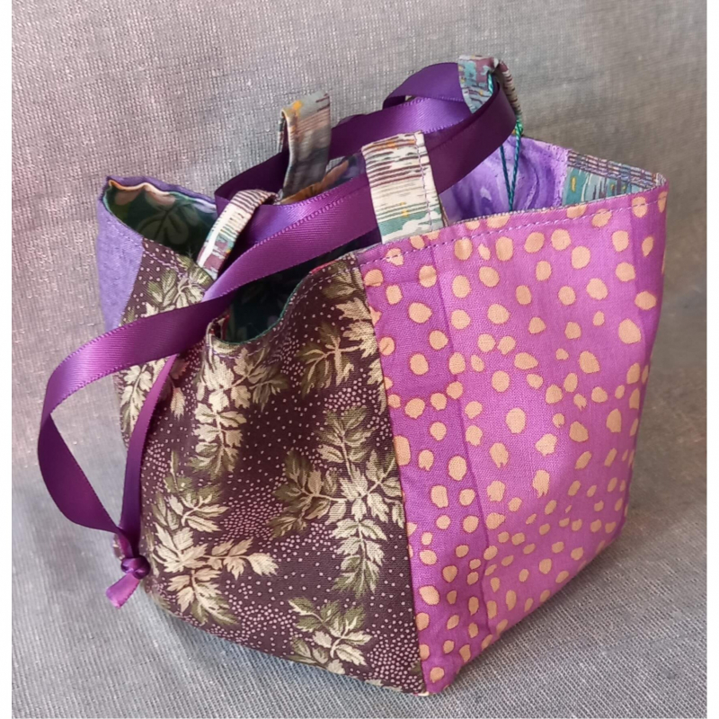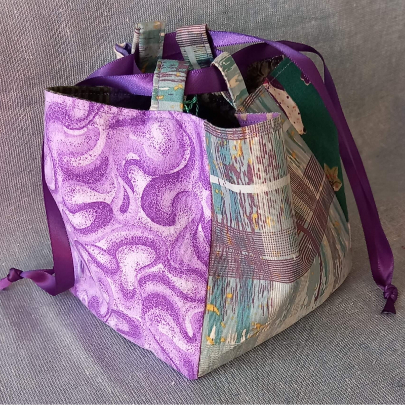 Stunning Japanese Rice Bag (Komebukuro) in shades of green and purple cotton with a beautiful purple satin ribbon tie. This bag is also reversible and can be used for many purposes. We like to use ours as gift bags for the special people in our lives.