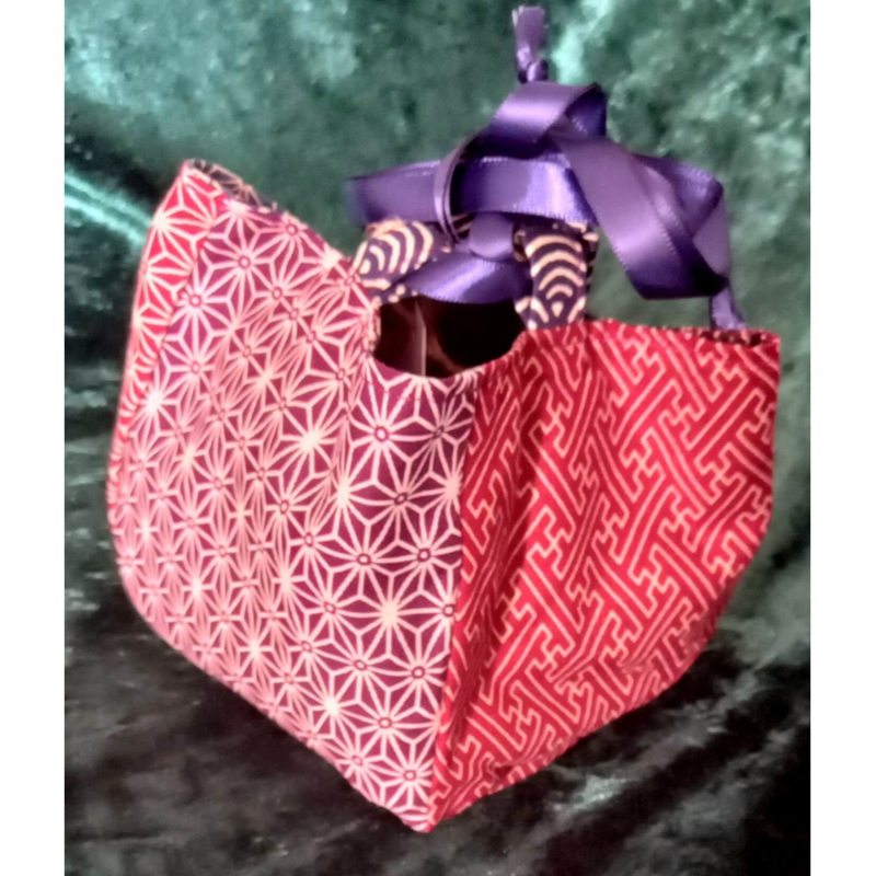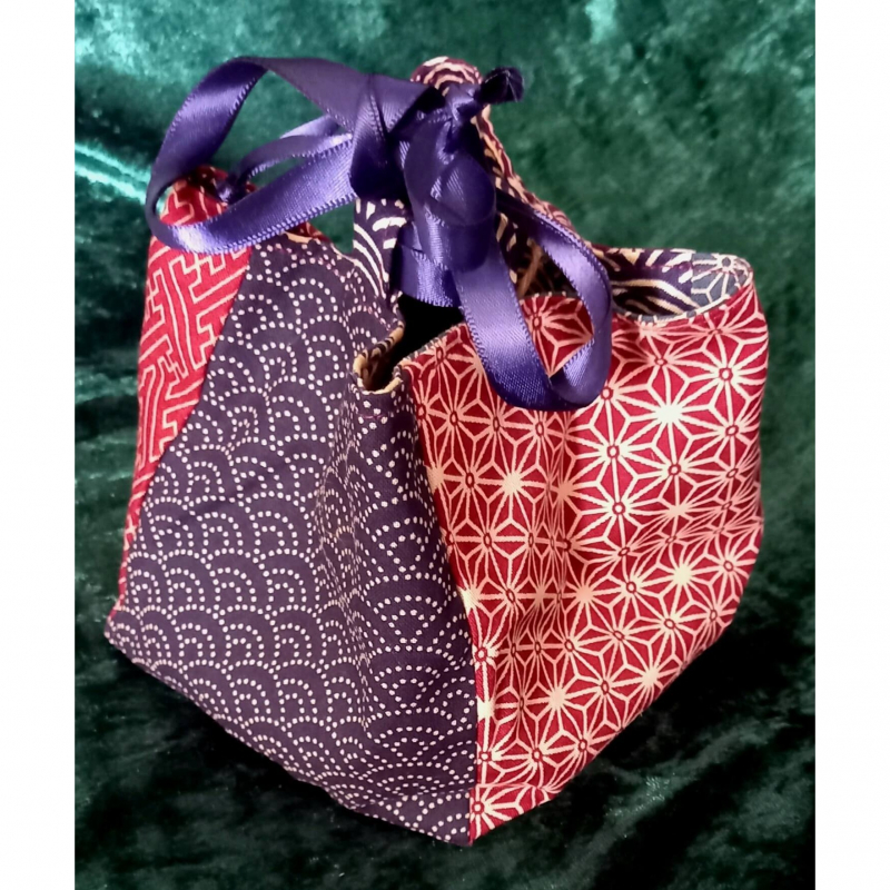 Beautiful Japanese Rice Bag (Komebukuro) in fantastic Japanese printed fabric with a navy satin ribbon tie. The fabric panels feature sashiko style prints in navy, blue, purple and brick red. This bag is also reversible and can be used for many purposes. We like to use ours as storage or as gift bags for the special people in our lives.