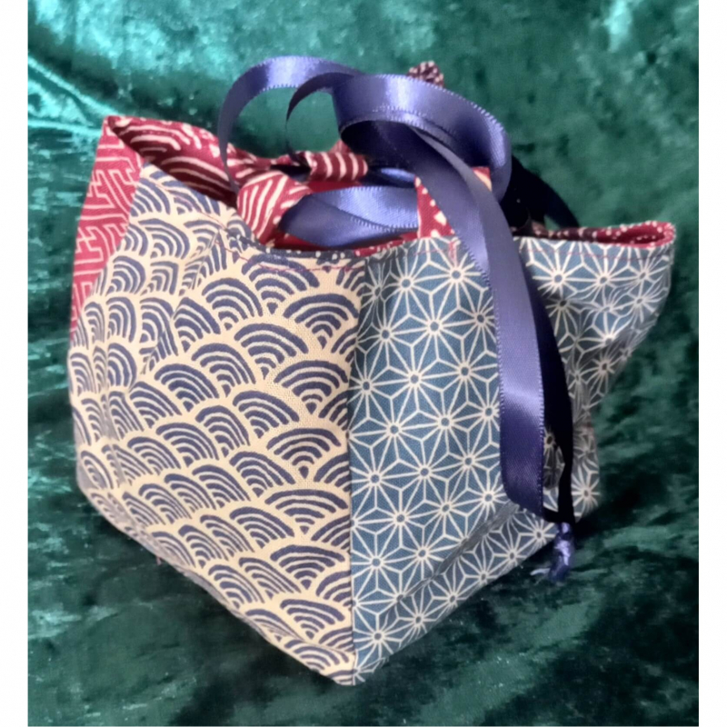Beautiful Japanese Rice Bag (Komebukuro) in fantastic Japanese printed fabric with a navy satin ribbon tie. The fabric panels feature sashiko style prints in navy, blue, purple and brick red. This bag is also reversible and can be used for many purposes. We like to use ours as storage or as gift bags for the special people in our lives.