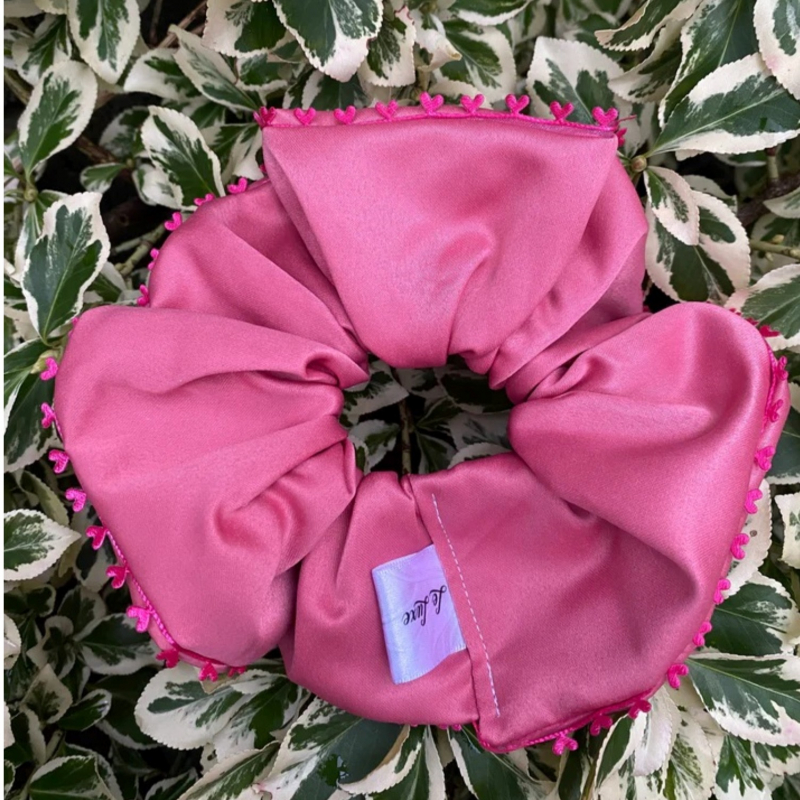 Made with our staple luxury duchess silk fabric we bring you this dusky rose standard sized scrunchie with hot pink sweetheart trim.