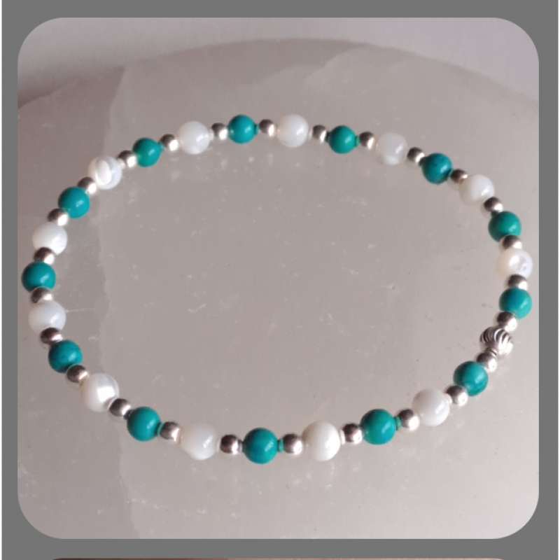 Elasticated Mother of Pearl Turquoise bracelet with sterling silver beads.