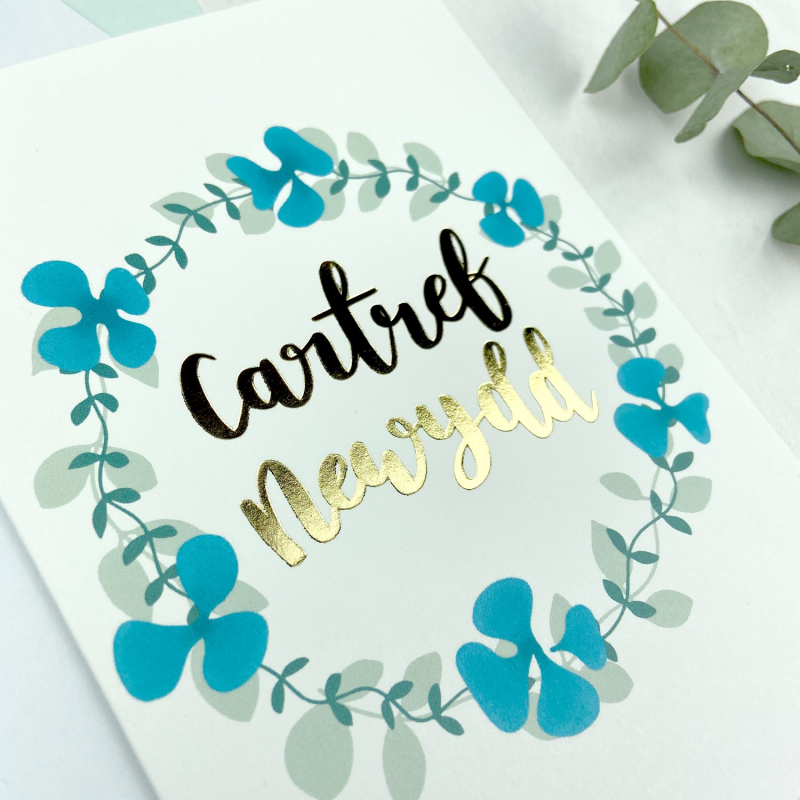 A luxury card featuring hand-written text, original illustration and gold foil. 'Cartref newydd' is Welsh for 'New home'.