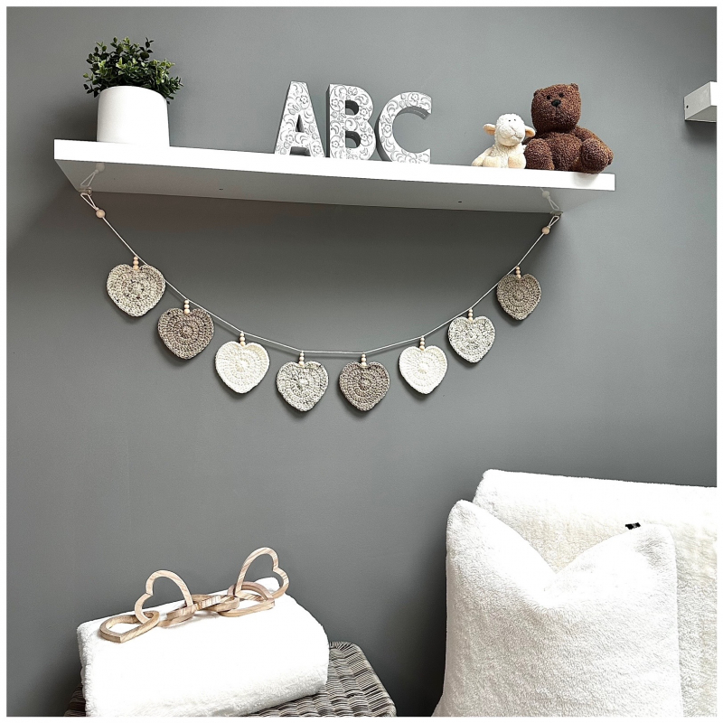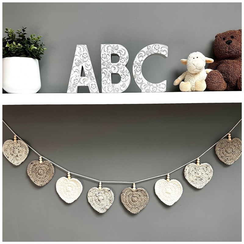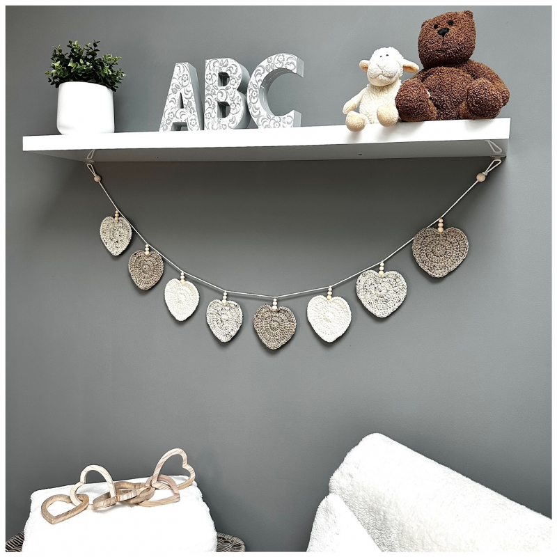 A luxurious garland, hand crocheted in Aran yarn combining natural tones of rich cream, delicate sand and light stone.