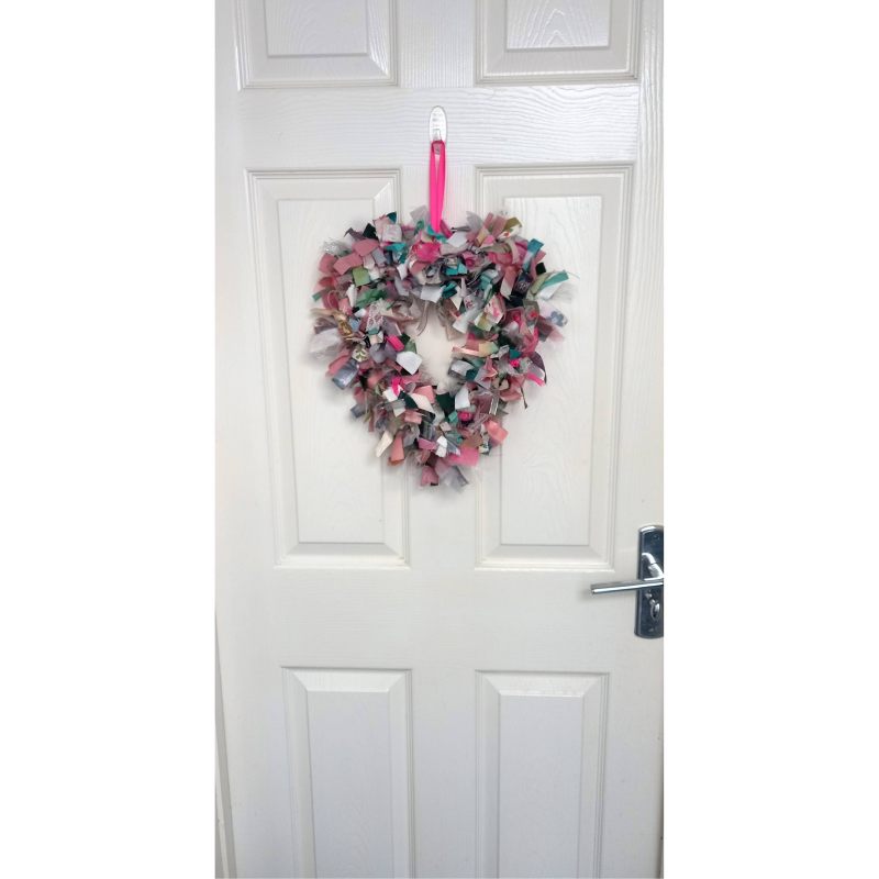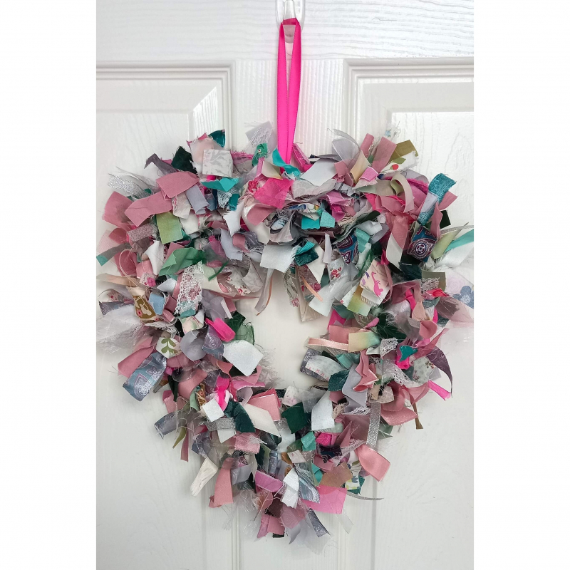 Beautiful and full of shabby chic style this heart shaped wreath aims to encompass that in shades of pinks, greys and greens.