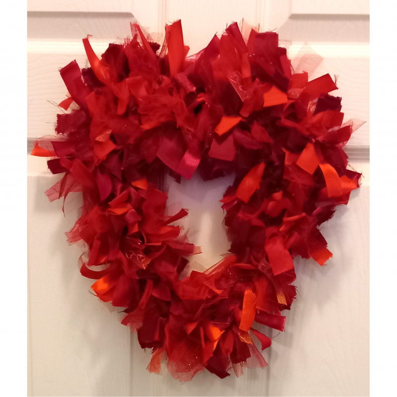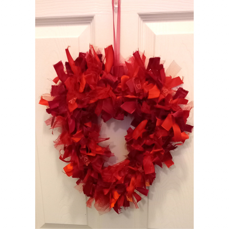 This beautiful handmade unique heart shaped rag wreath features fabric in various shades of red.