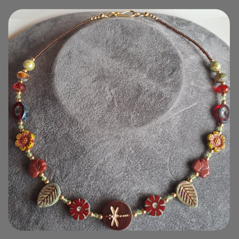 Red, Green, Brown and Gold Czech Glass Floral Dragonfly Necklace with Peridot and Vermeil.