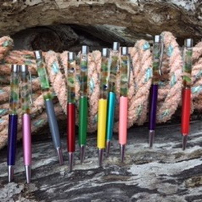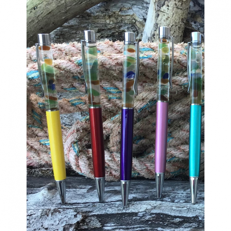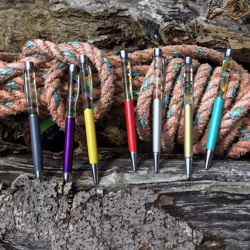 A selection of multi coloured authentic Anglesey seaglass filled pens or seashells filled in separate pens. A metal bodied pen with top half filled with tiny pieces of authentic Anglesey seaglass or if you prefer Anglesey seashells .Included are cowrie shells which are rare to find The pens have black ink.They are lovely to write with in black ink.