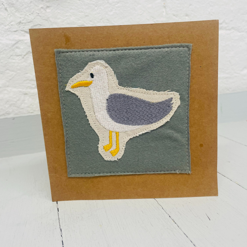 The seagull is embroidered onto cream fabric and then sewn onto grey wool blend felt and mounted onto a brown Kraft card and comes complete with envelope and clear presentation bag .