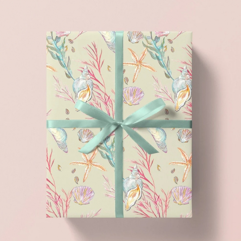 One sheet of wrapping paper featuring exclusive shell/under the sea pattern, perfect for lovers of the sea! Hand drawn/painted and designed by Emily Hacker Textiles. Measures 70cm x 50cm but will arrive lightly FOLDED to fit inside an A4 postal box.