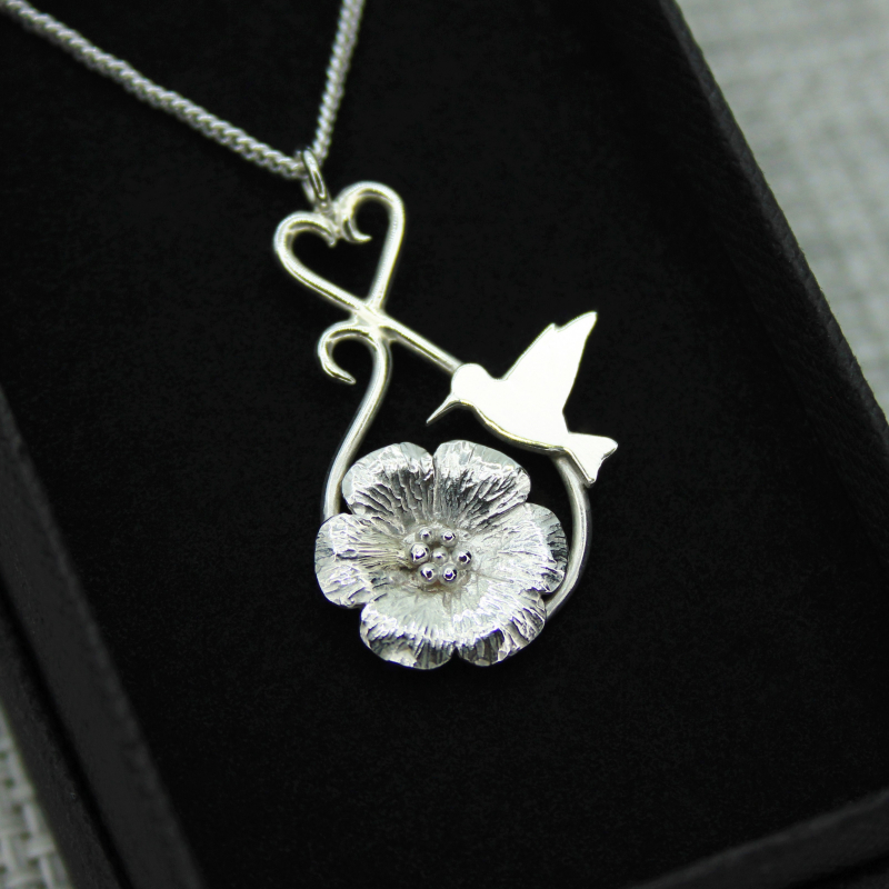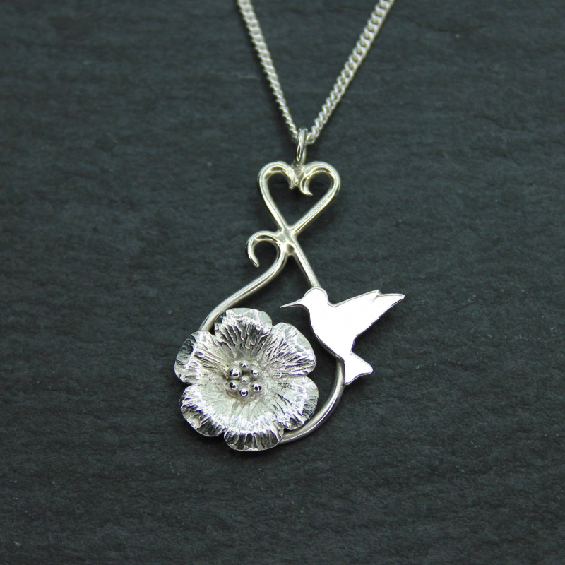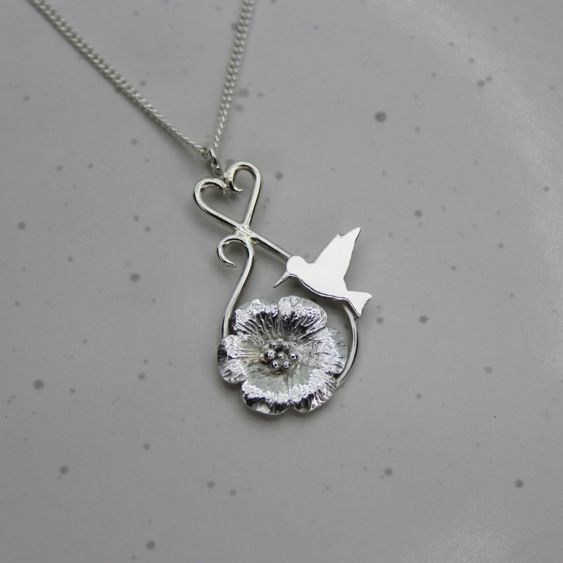 This unique pendant is handcrafted from eco sterling silver. The flower and bird are hand drawn and cut from recycled silver, all sat together on a beautiful unique pendant. This pendant is uniquely handcrafted, and sits on a delicate 45cm/18” curb chain.