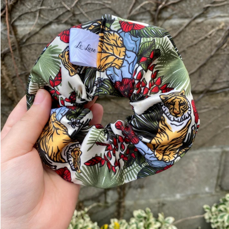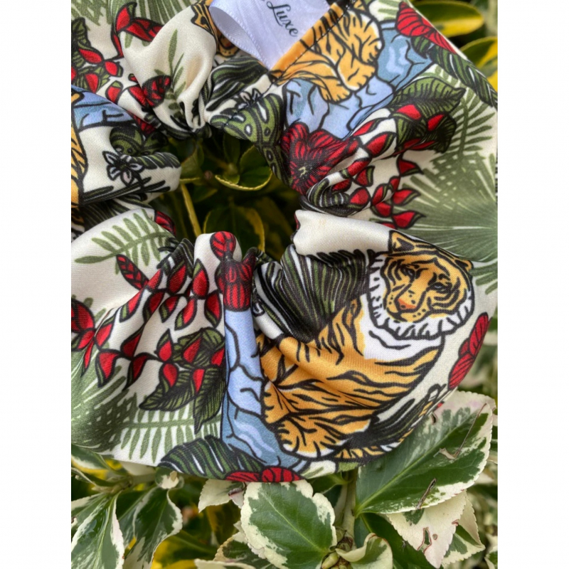 A beautiful jungle themed scrunchie made from only the best quality duchess silk fabric