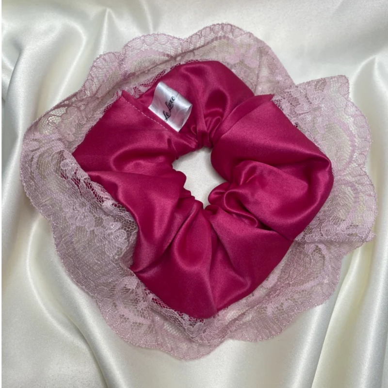 A unique scrunchie made from only the best quality cerise pink duchess silk fabric paired with a gorgeous dusky pink lace