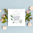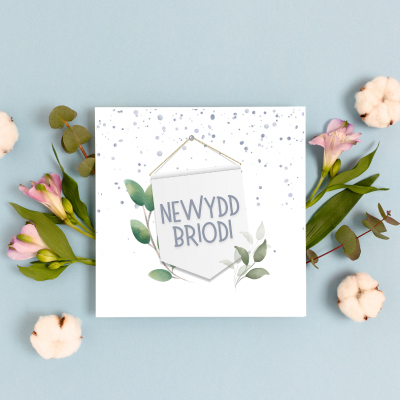 This Welsh wedding card features a hanging pennant with the words "Newydd Briodi" ("Just Married"), and an elegant botanical design.